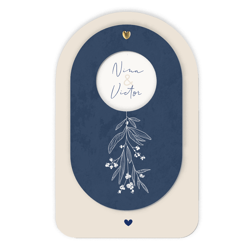 Een uniek en luxe trouwkaart welke bestaat uit 2 delen. De onderste kaart heeft een Arch vorm en ronde hoeken. De bovenste ovale kaart heeft een doorkijkje waardoor jullie namen zichtbaar worden. Hier met een lief takje met bloemetjes in contrast kleuren, maar deze kun je ook vervangen voor een andere tekening. Je kunt de elementen eventueel ook andere kleuren geven in onze online editor. Leuke splitpennen of touwtjes vind je ook op onze site om de kaarten te bevestigen. Bestel snel een proefdruk om dit kaartje in het echt te zien!
