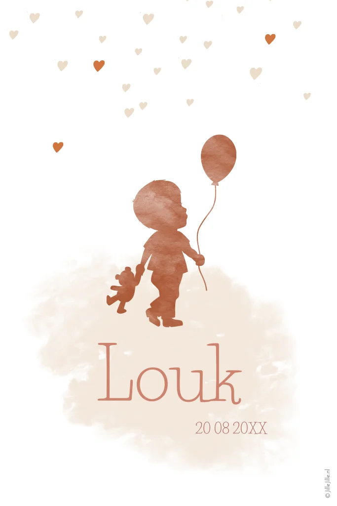 Leuke poster met het silhouet van een jongetje met een beertje en een ballon met een waterverf effect.