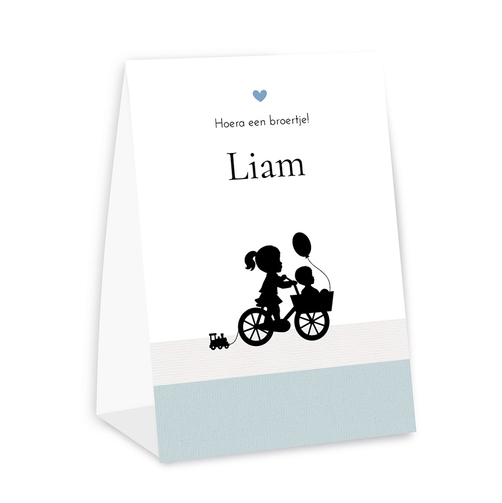 Een schattig geboortekaartje hier met een silhouet van een jongetje op de fiets met zijn grote zus, de kaart heeft de vorm van een tentje. Dit lieve jongenskaartje in de vorm van een tentje, met een silhouet van een broertje en grote zus op de fiets, kun je in elkaar vouwen zodat het leuk kan blijven staan! De illustraties, het silhouet kun je zelf aanpassen naar een meisje of voor meerdere kinderen met de afbeeldingen uit onze beeldbank. Dit tent-vorm kaartje staat prachtig op de kast of dressoir en is een leuke blikvanger. Bewerk dit schattige kaartje naar eigen idee.