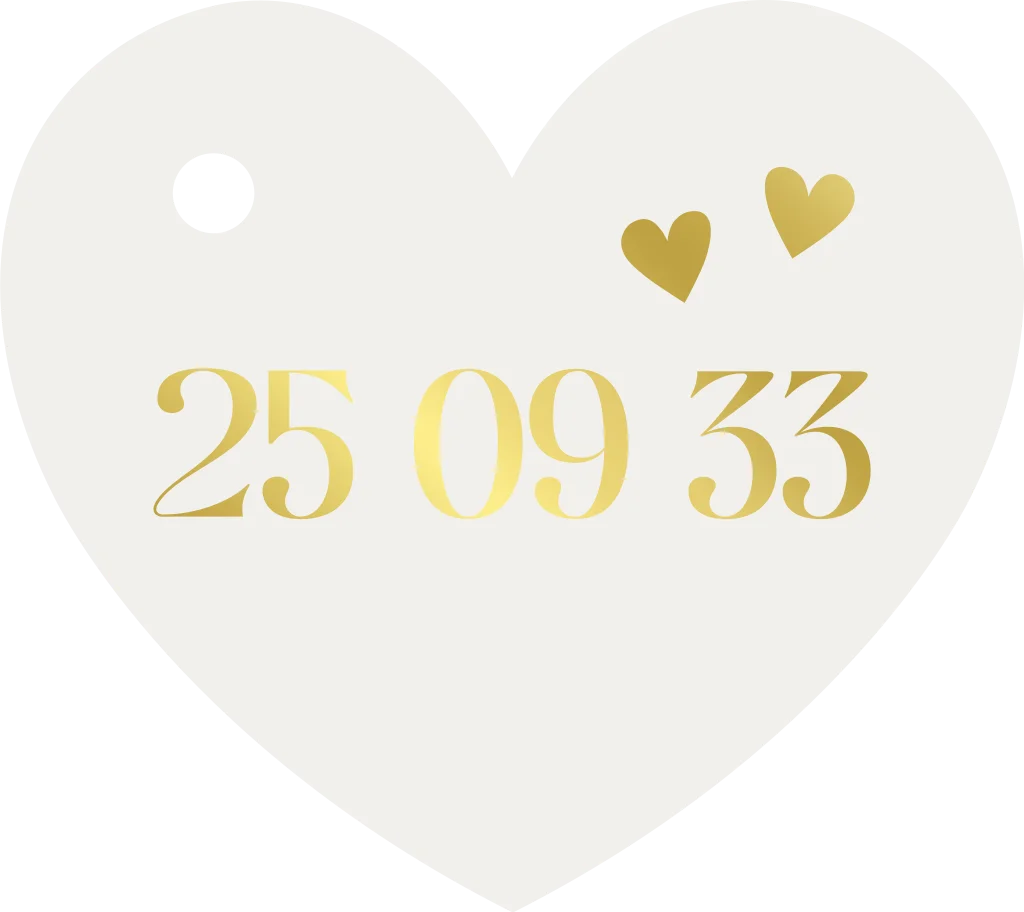 Maak zelf een leuk labeltje in de vorm van een hartje in dezelfde stijl als jouw trouwkaart. Dit labeltje met een gaatje, kun je zelf ontwerpen en is 4 x 4.5 cm. Bewerk dit hartvorm labeltje, hier met goudfolie en de datum van jullie bruiloft, in onze online editor en maak het naar je eigen idee zodat het leuk bij jouw trouwkaart past.