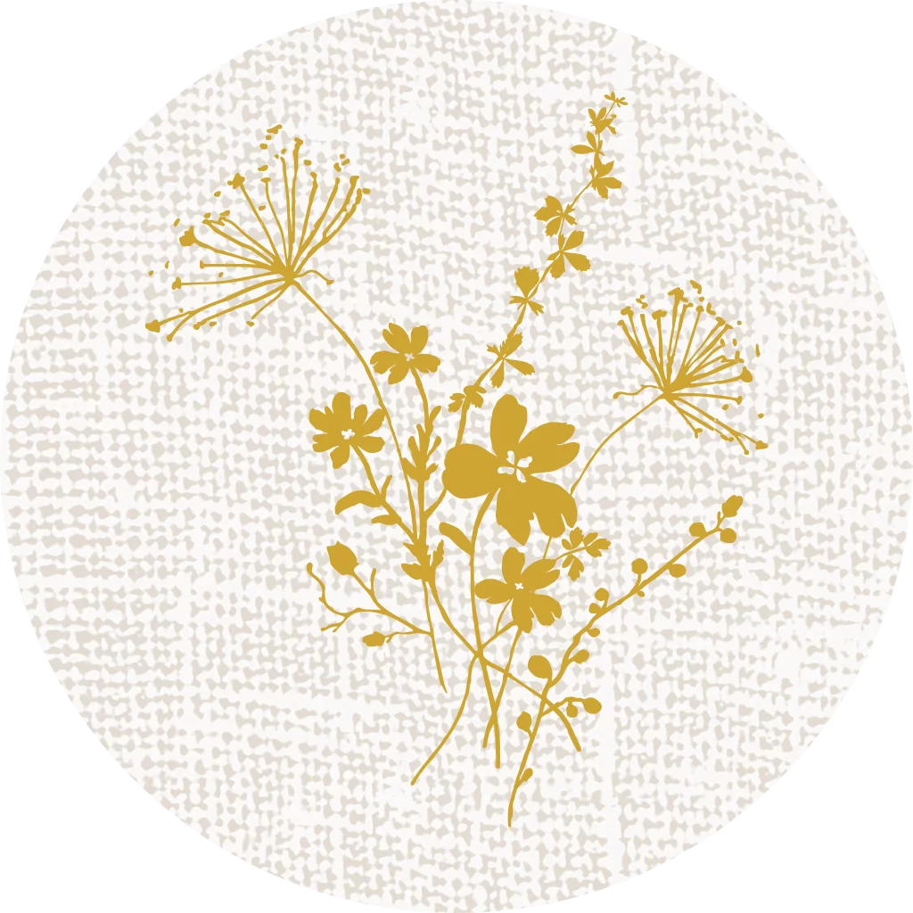 Botanische sluitzegel behorend bij de huisstijl met een linnen structuur achtergrond en een silhouet van bloementjes en takjes