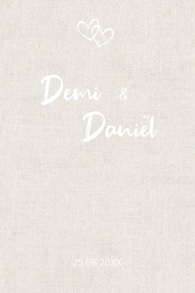 Stijlvolle trouwkaart met de namen in goudfolie en een linnen structuur achtergrond. Deze minimalistische kaart kun je zelf eenvoudig bewerken of versieren met een label, droogbloem of een lint.