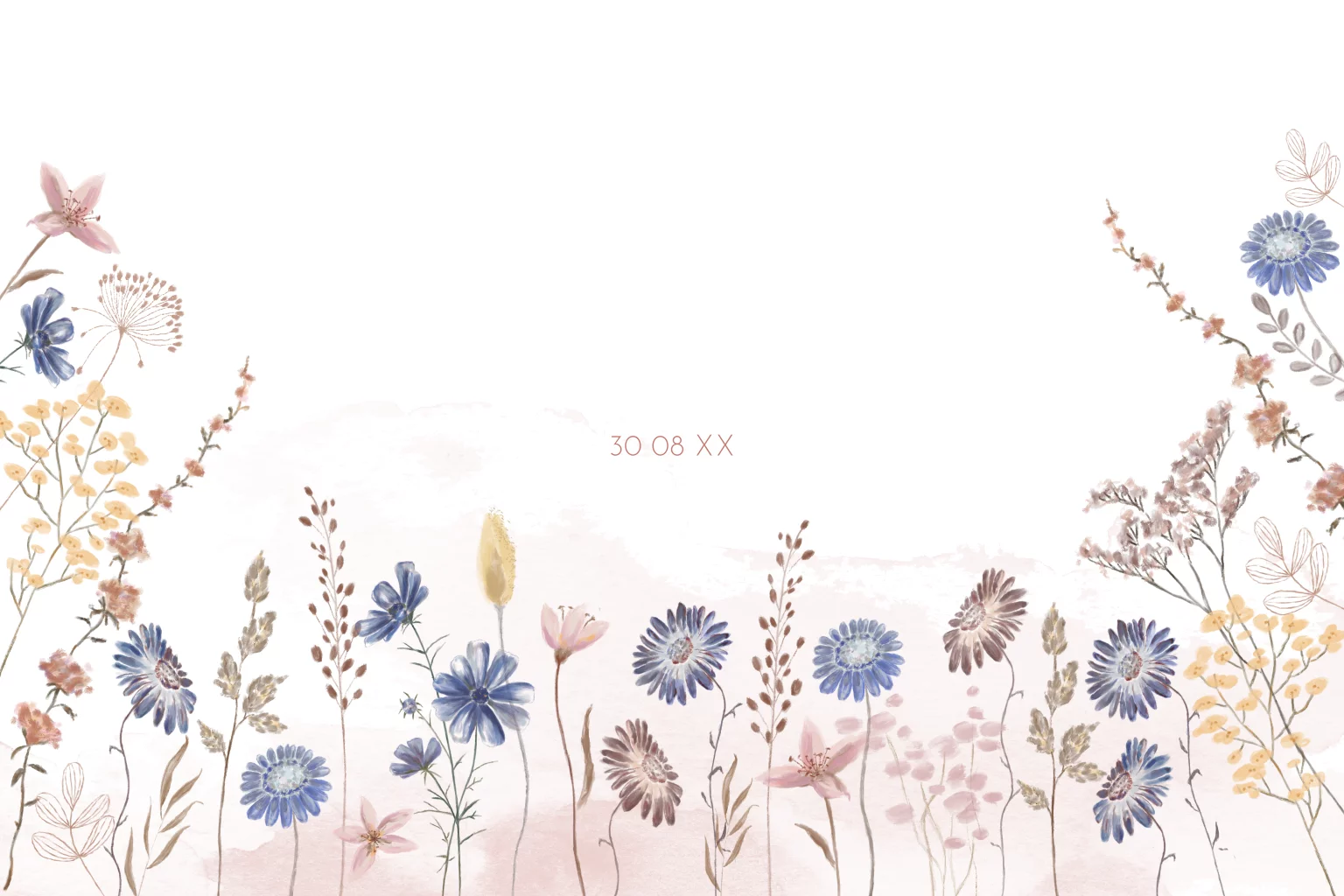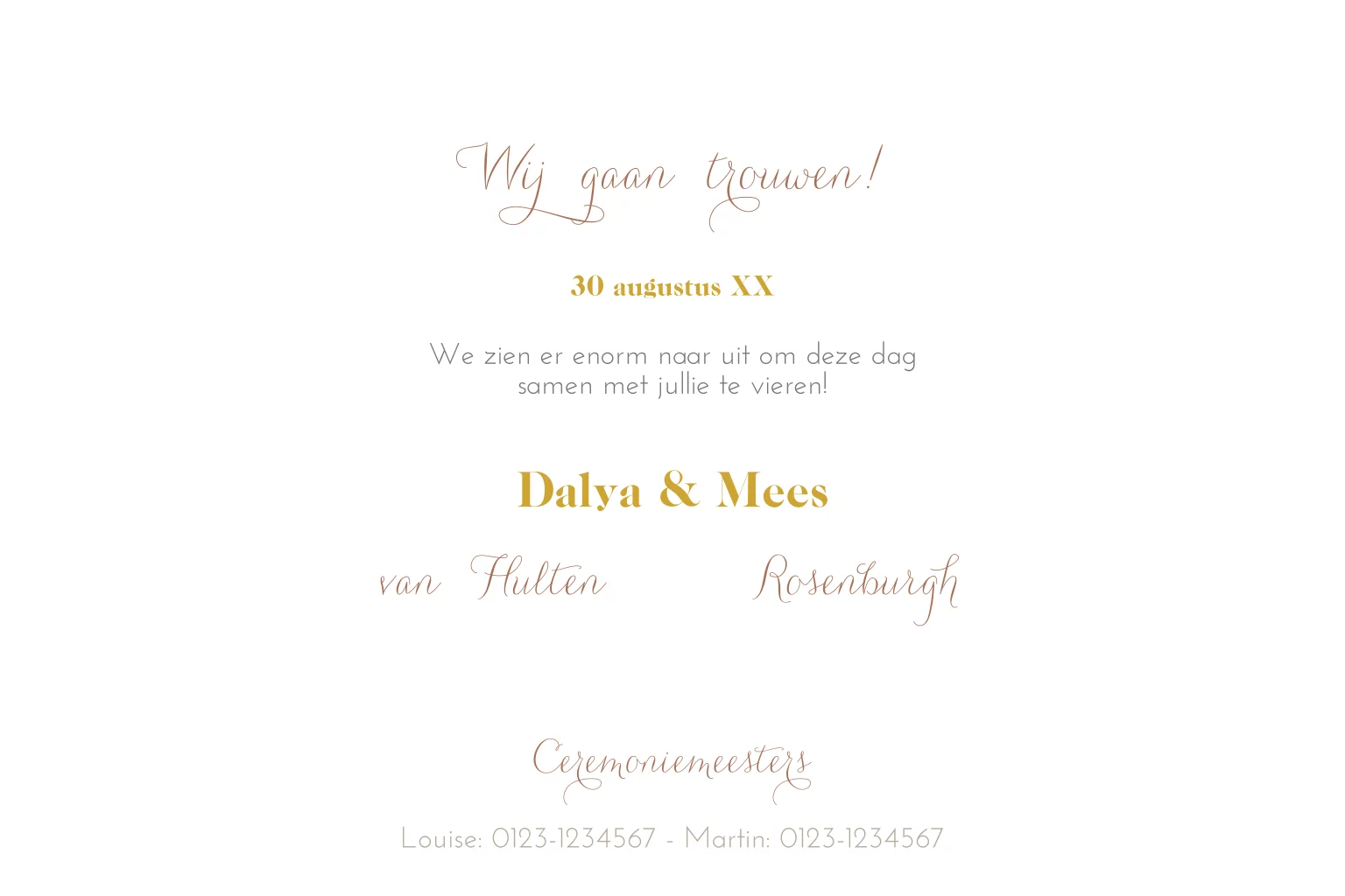 Een stijlvolle trouwkaart met waterverf illustraties van bloemen in bruine, roze en blauwe tinten en jullie namen in gouden foliedruk