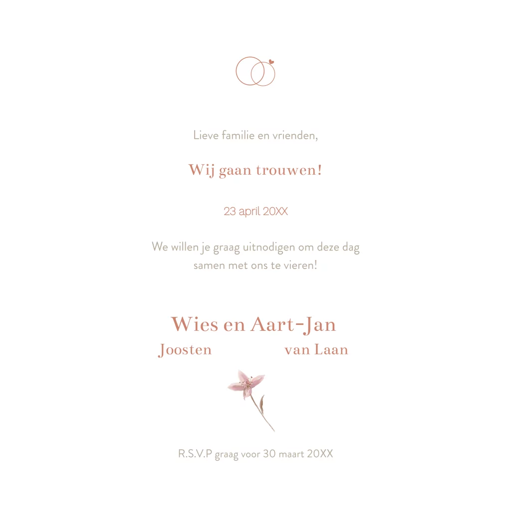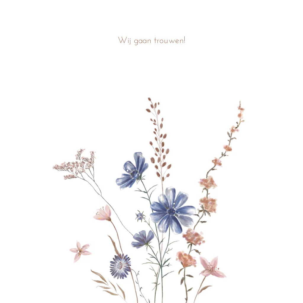 Een sjieke folie trouw uitnodiging met jullie namen in rosé foliedruk wat een mooie glans geeft aan de tekst. Op deze trouwkaart, illustraties van verschillende veldbloemen in roze en blauwe tinten.