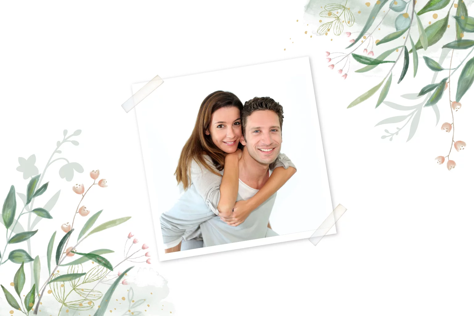 Prachtige bedankkaart met getekende bloemen en bladeren in groene en roze tinten. Plaats jouw leukste foto van de bruiloft en stuur deze kaart om je gasten te bedanken