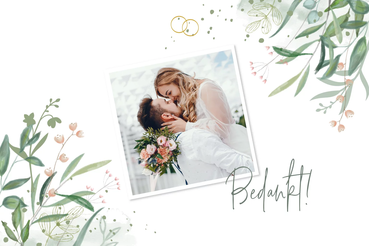 Mooie bedank kaart bij jullie huwelijk met foto en blaadjes