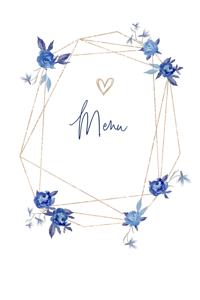 Stijlvolle menu kaart met blauwe met waterverf geschilderde rozen. Bij deze kaart is een huisstijl beschikbaar. Neem contact op als je liever een ander formaat zou willen.