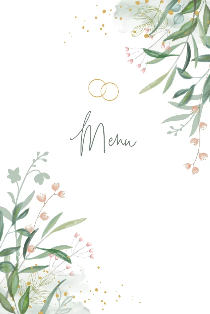 Deze menukaart is deel van de trouwhuisstijl met geschilderde takjes en bloemetjes en kun je met of zonder foliedruk bestellen.