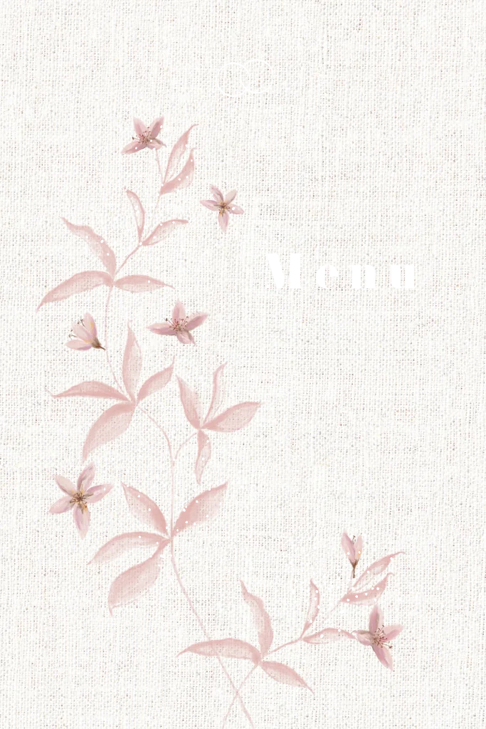Een mooie menukaart met een linnen-look achtergrond en hand getekende tak met blaadjes en pastel kleurige bloemetjes en rosé foliedruk