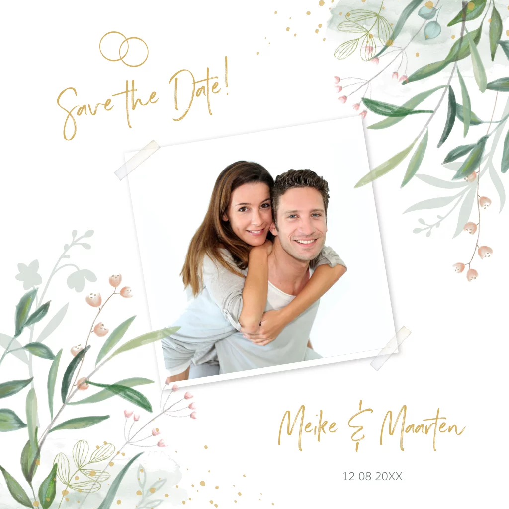 Mooie getekende Save-the-Date kaart met jullie leukste foto en illustraties van fantasie bloemen en planten.