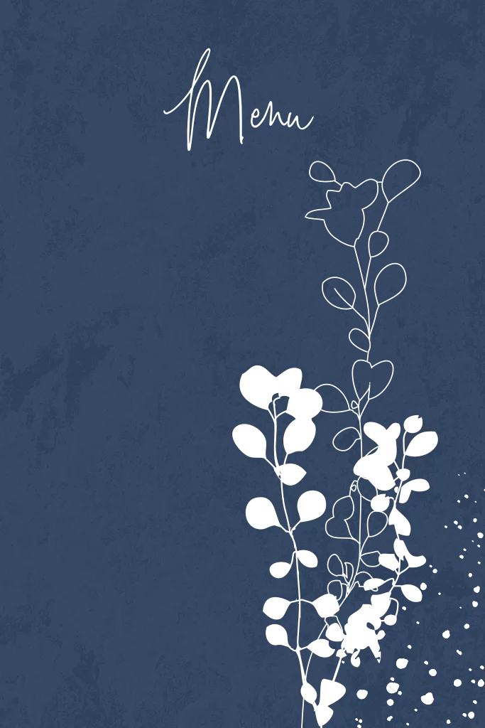 Prachtige menukaart met goudfolie bladeren vol en in outlines op een velours achtige donkerblauwe achtergrond.