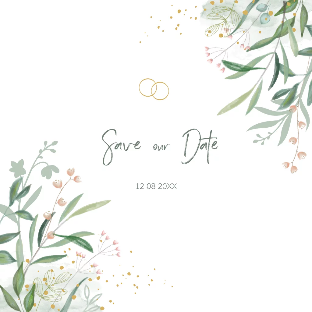 Mooie save-the-date kaart met ronde hoeken en hand geschilderde blaadjes en bloemen. Deze kaart past in de trouwhuisstijl met getekende botanische elementen te vinden op onze site