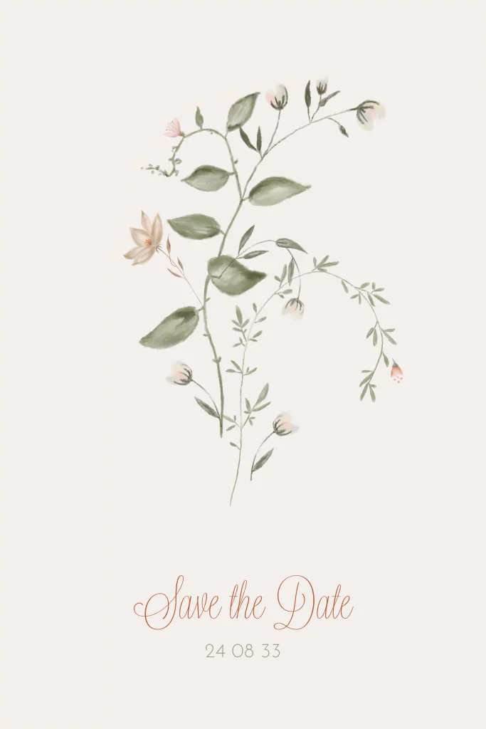 Save-the-date kaart met getekende takjes en bloemen