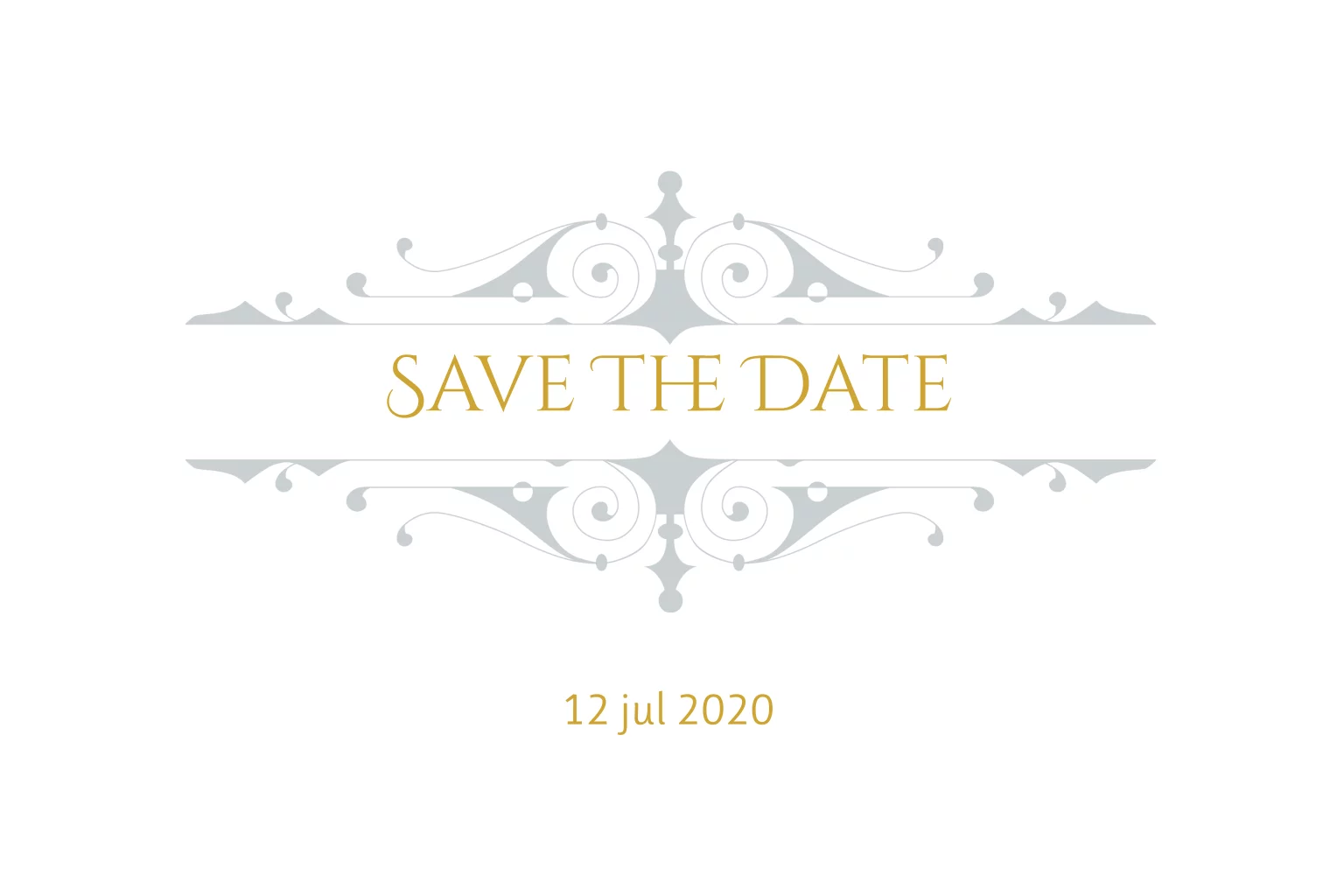 Stijlvolle grafische save-the-date-kaart in jugenstil-stijl om zelf te maken. Je kunt de teksten en kleuren zelf aanpassen bij deze bijzondere mooie trouwkaart.