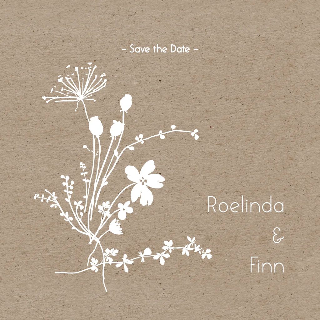 Stoere Save-the-date kaart met een boeket veldbloemen in silhouet op een kraft-look achtergrond. Zorg dat jouw vrienden en familie de dag voor jullie huwelijk vrijhouden door tevoren deze save de date kaart toe te sturen. Bekijk de gehele huisstijl voor meer variaties