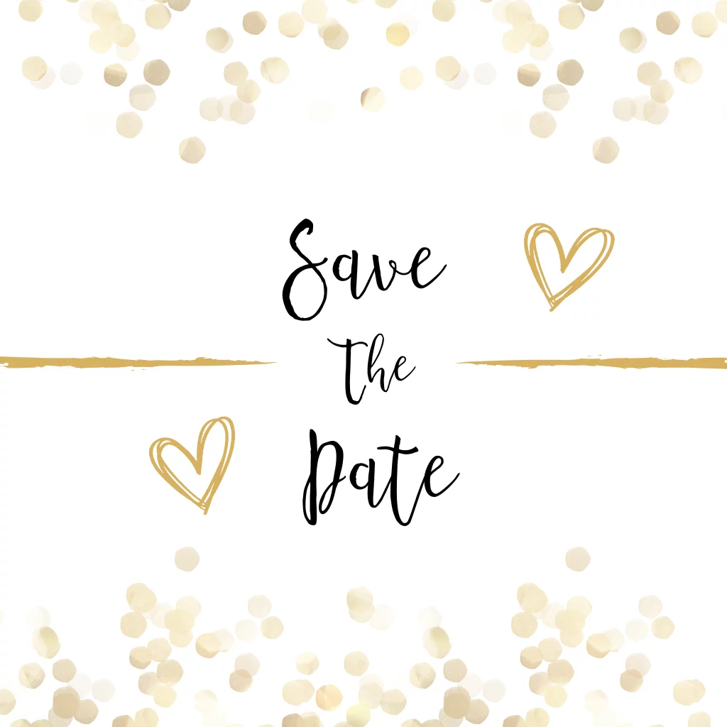 Lieve moderne save-the-date-kaart met goud-kleurige confettti op witte achtergrond voor een prachtig huwelijk.