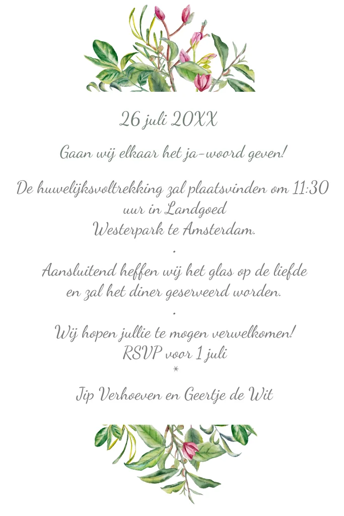 Staande enkele trouwkaart met groene bladeren en bloemetjes langs de rand voor een fantastisch huwelijksfeest. proefdruk €1,-, verzenden gratis!
