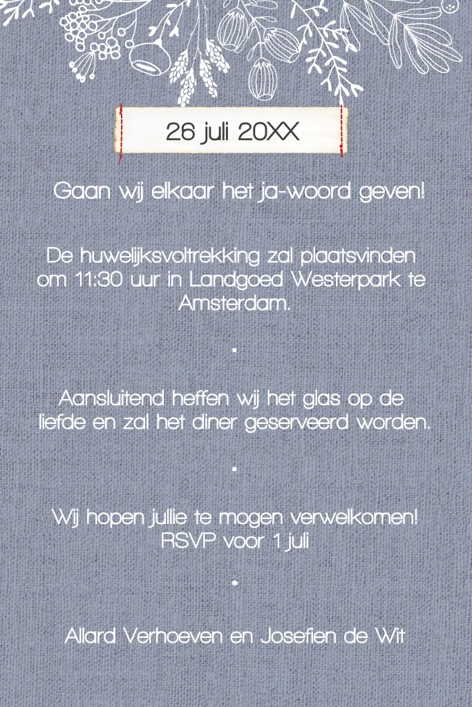 Staande enkele trouwkaart met getekende bloemen en een vintage etiket voor jullie huwelijksfeest. proefdruk €1,-, verzenden gratis!