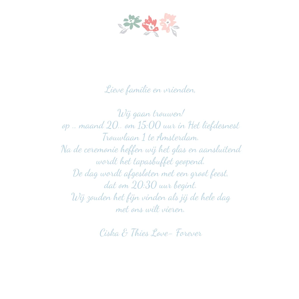 Lieve trouwkaart met kleine bloemen om zelf te maken. Je kunt de teksten zelf aanpassen bij deze bijzondere trendy trouwkaart.