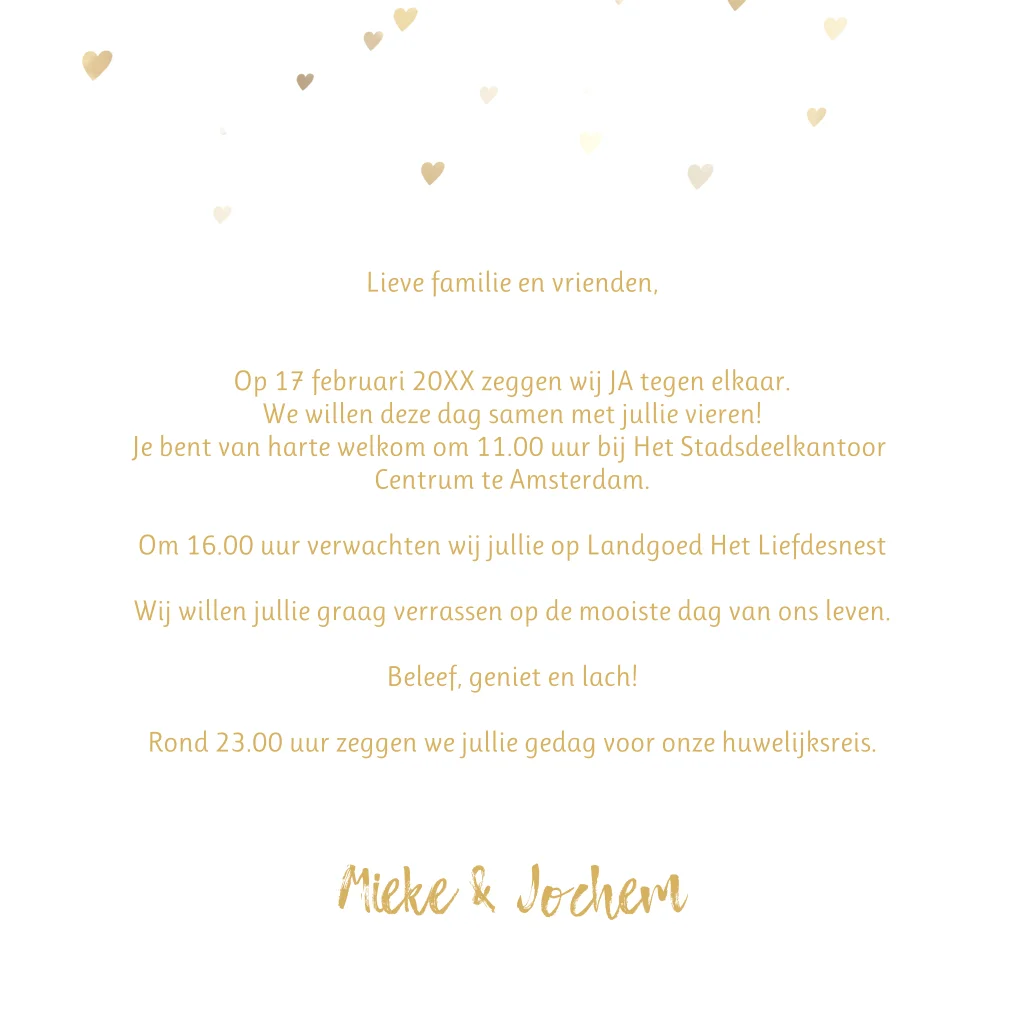 Lieve moderne trouwkaart met goud-kleurige dwarrelende hartjes en jullie eigen mooiste foto voor een prachtig huwelijk.