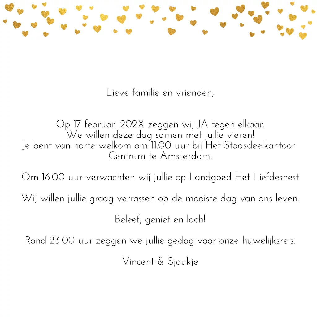 Lieve moderne trouwkaart met goud-kleurige dwarrelende hartjes op witte achtergrond voor een prachtig huwelijk.