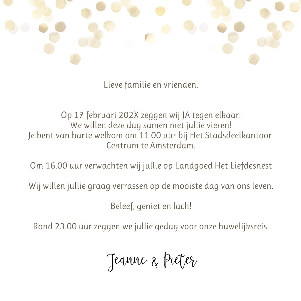 Lieve moderne trouwkaart met goud-kleurige confettti op witte achtergrond voor een prachtig huwelijk. ook met goudfolie verkrijgbaar.