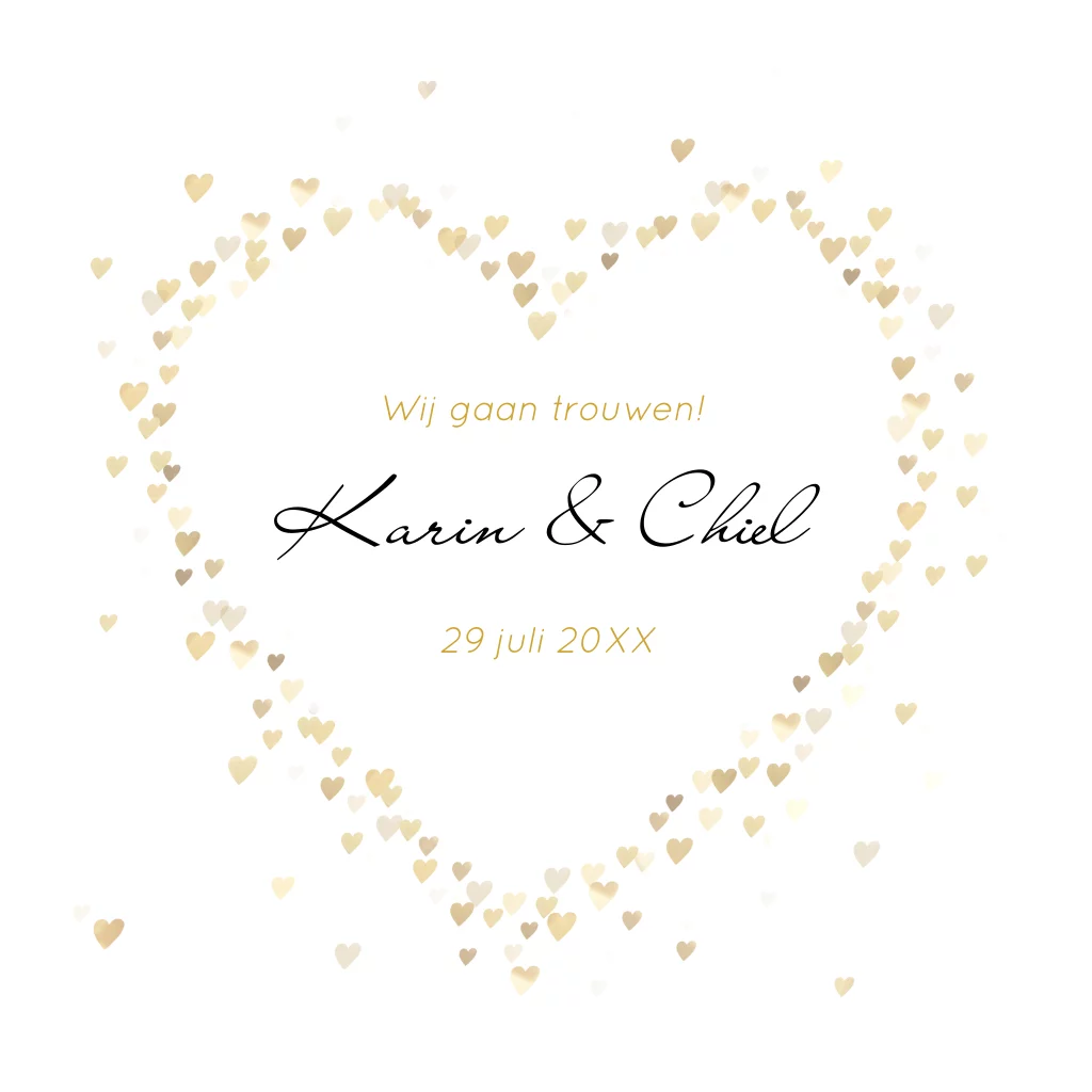 Stijlvolle moderne trouwkaart met goud-kleurige hartjes in de vorm van een hart op een witte achtergrond.