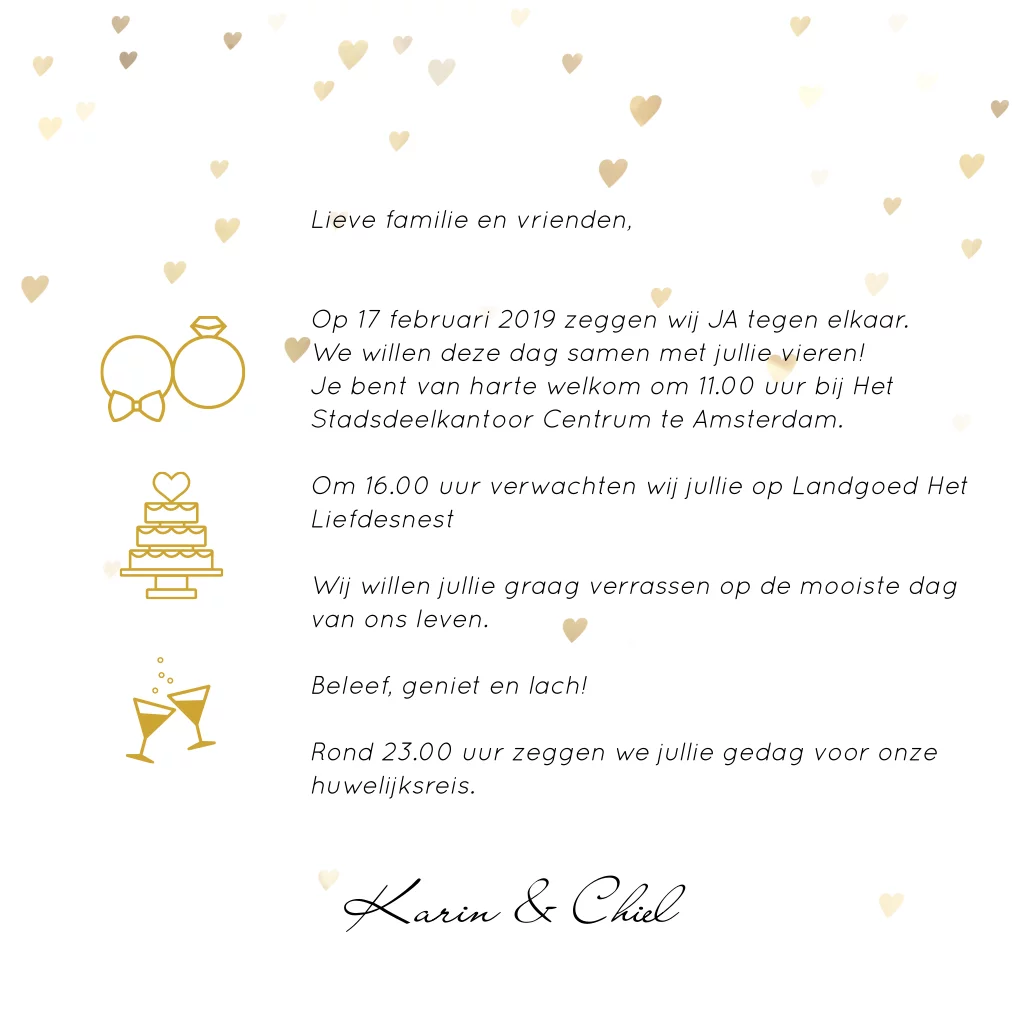 Mooie trouwkaart met goudkleurige hartjes in hartvorm