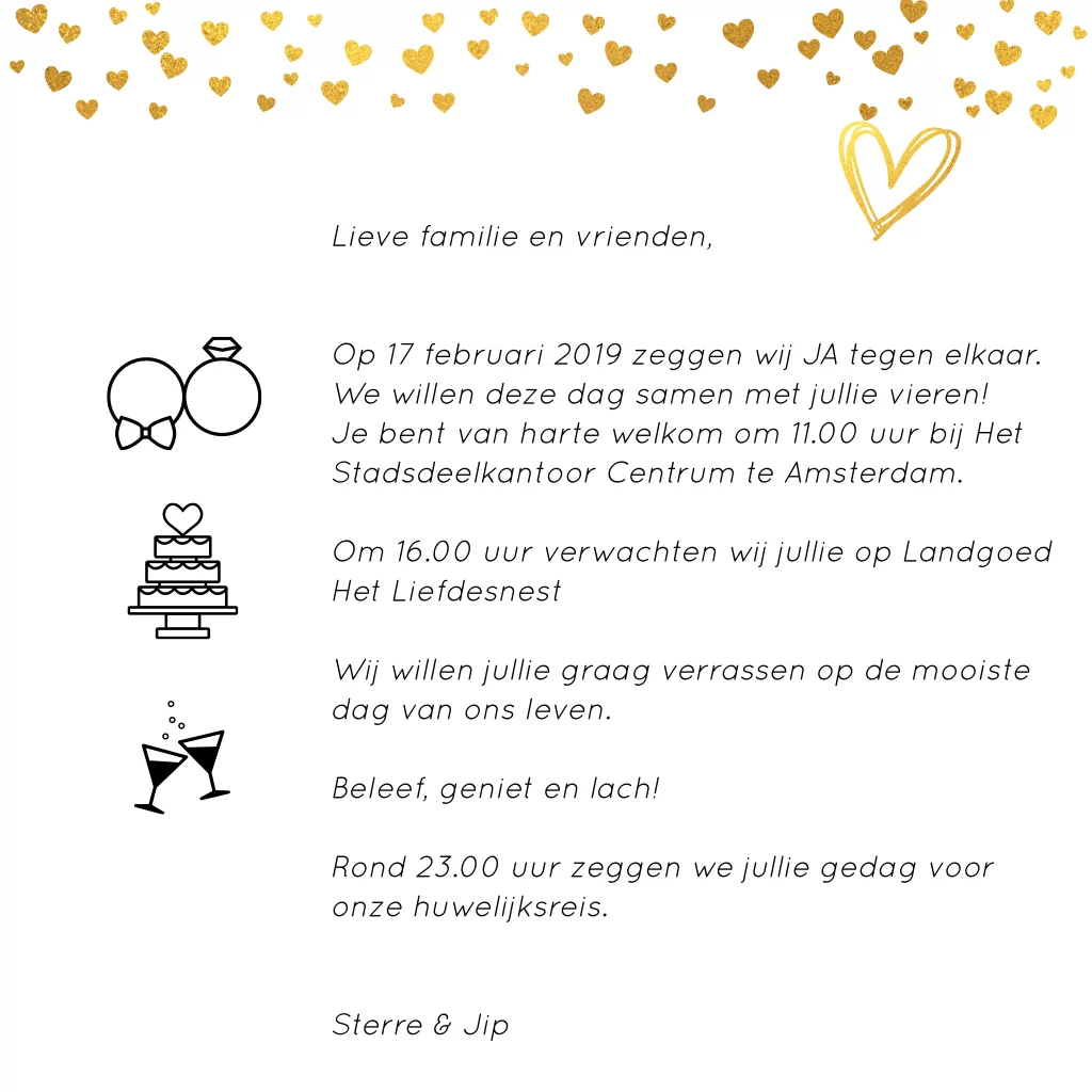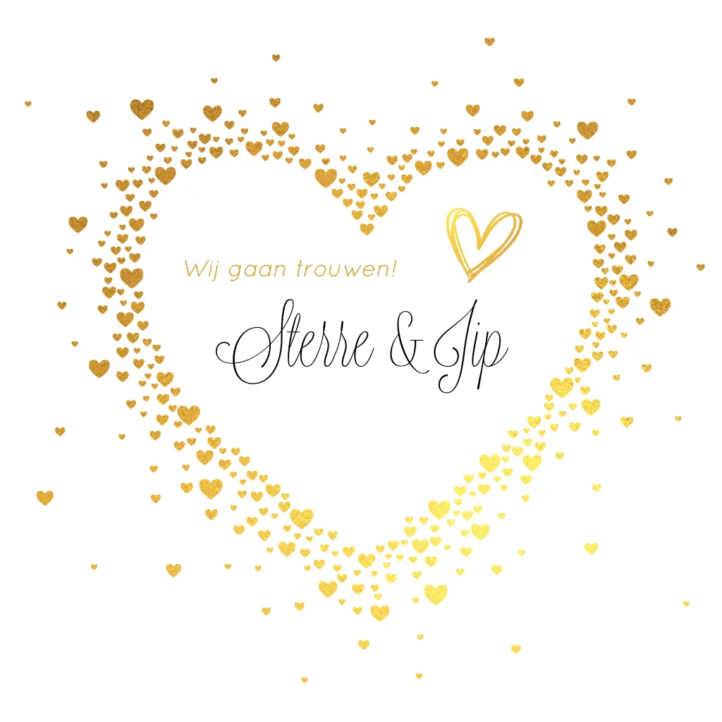 Stijlvolle moderne trouwkaart met goud-kleurige hartjes in de vorm van een hart op een witte achtergrond.