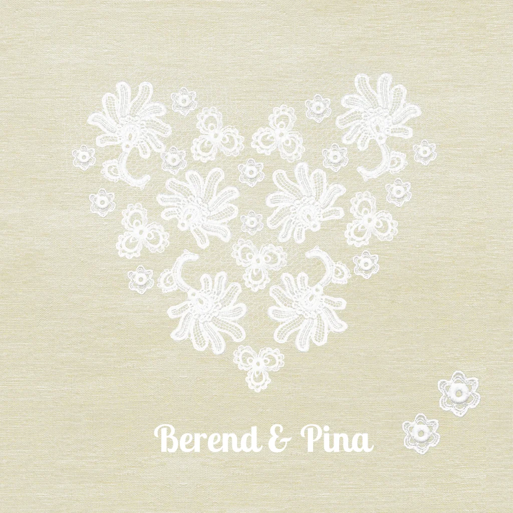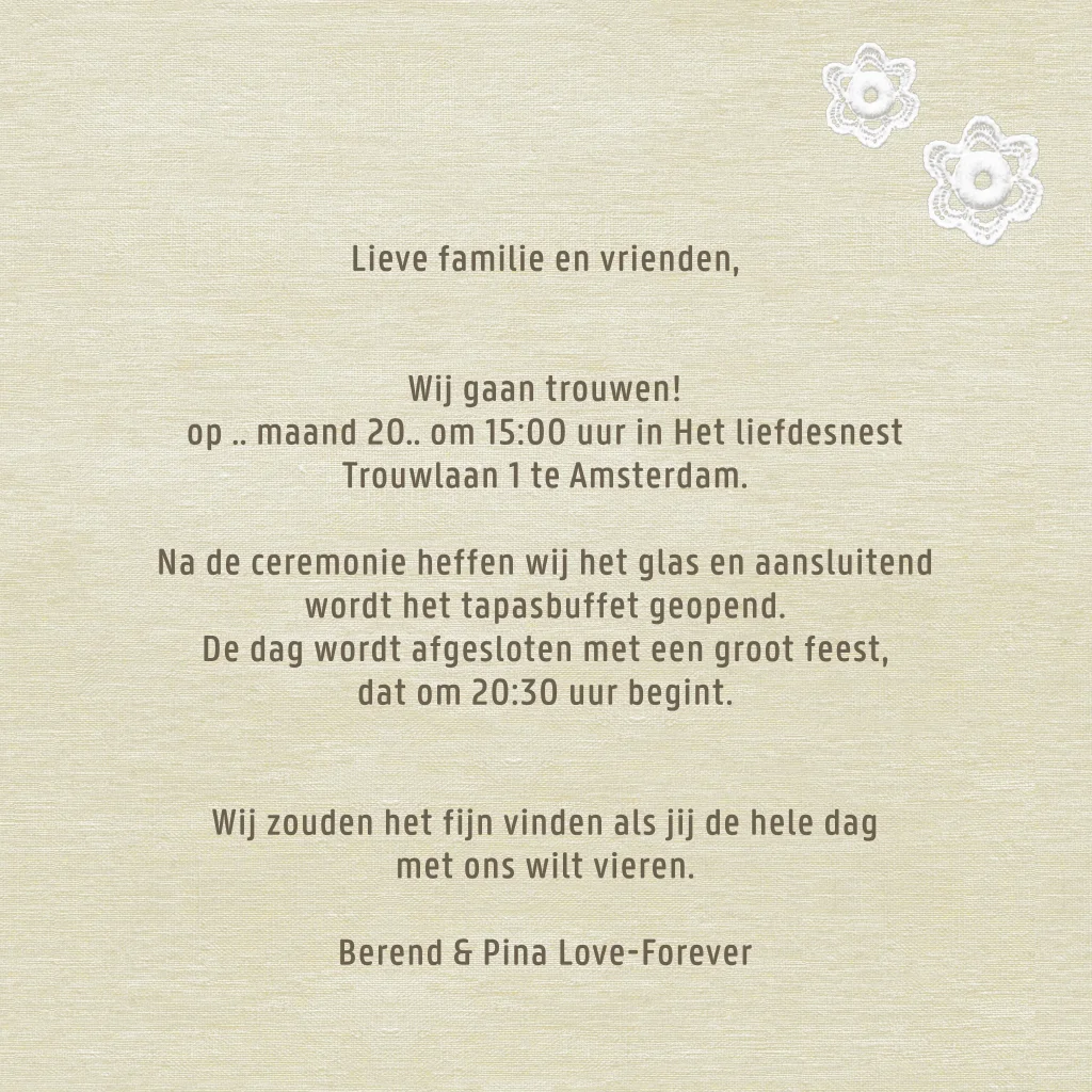 Stijlvolle, moderne trouwkaart met hartje van kanten bloemetjes op mooi linnen. Je kunt de teksten zelf aanpassen bij deze bijzondere liefdevolle trouwkaart.