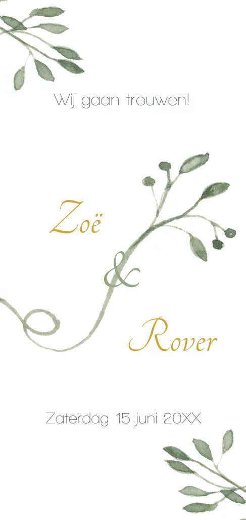 moderne staande trouwkaart met waterverf takjes