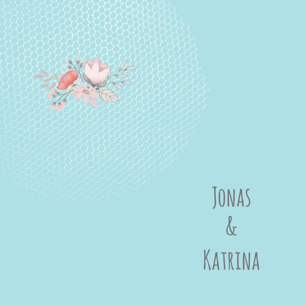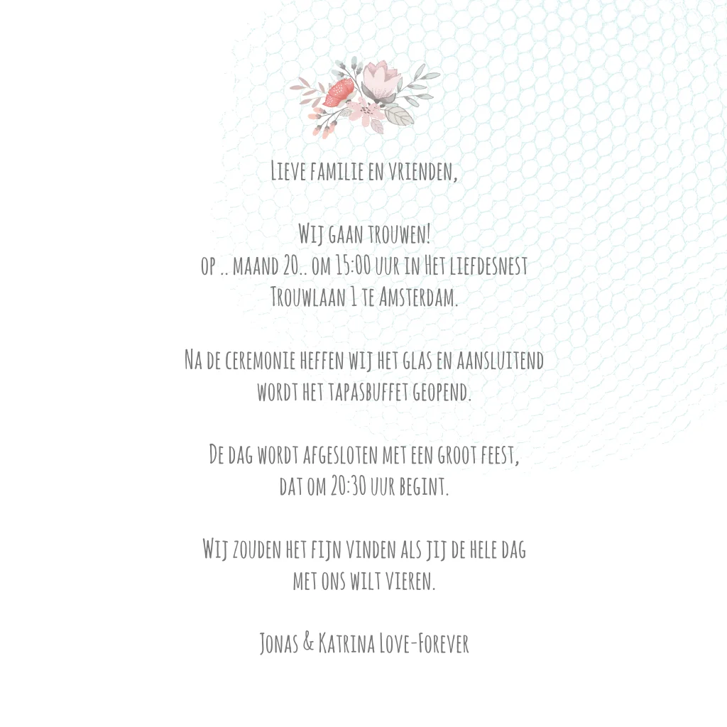 Stijlvolle, originele trouwkaart met tule en bloemen boeket. Je kunt de kleuren en teksten zelf aanpassen bij deze originele romantischetrouwkaart.