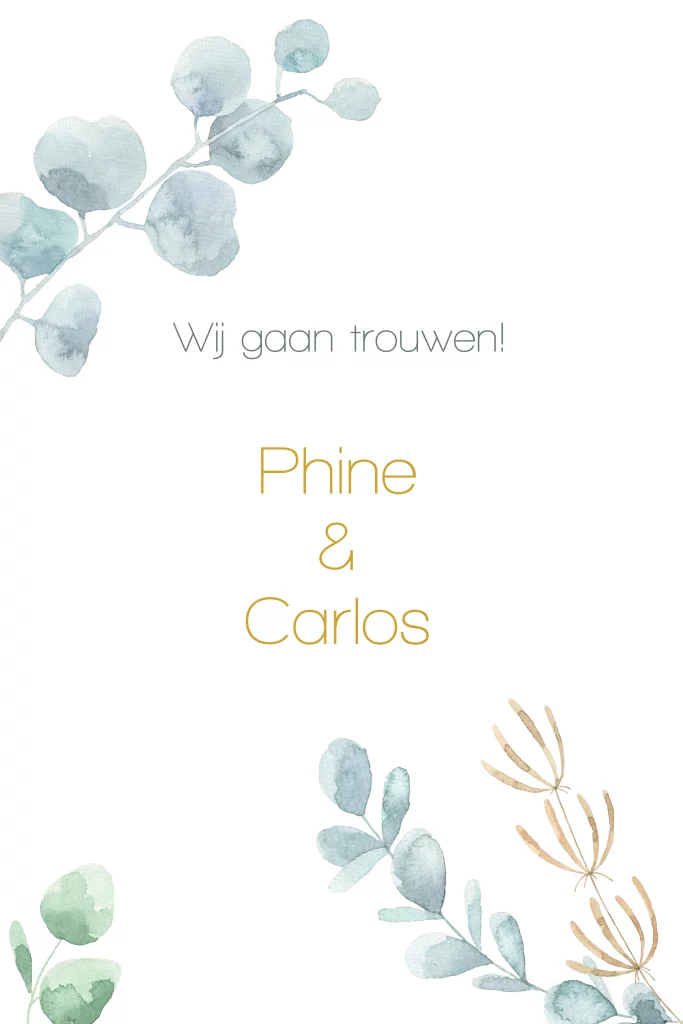 Staande enkele trouwkaart met waterverf blaadjes langs de rand voor een fantastisch huwelijksfeest. proefdruk €1,-, verzenden gratis!