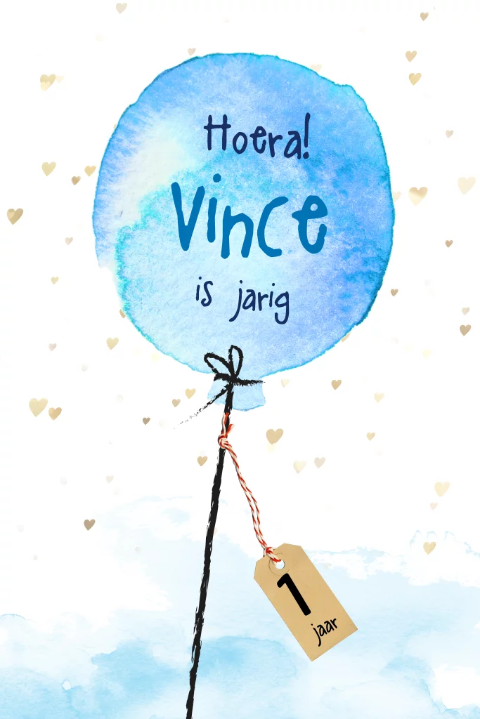 Leuke verjaardag uitnodiging met een ballon van waterverf en kleine hartjes. Pas zelf de leeftijd aan. Deze kaart is ook te gebruiken als geboortekaartje.