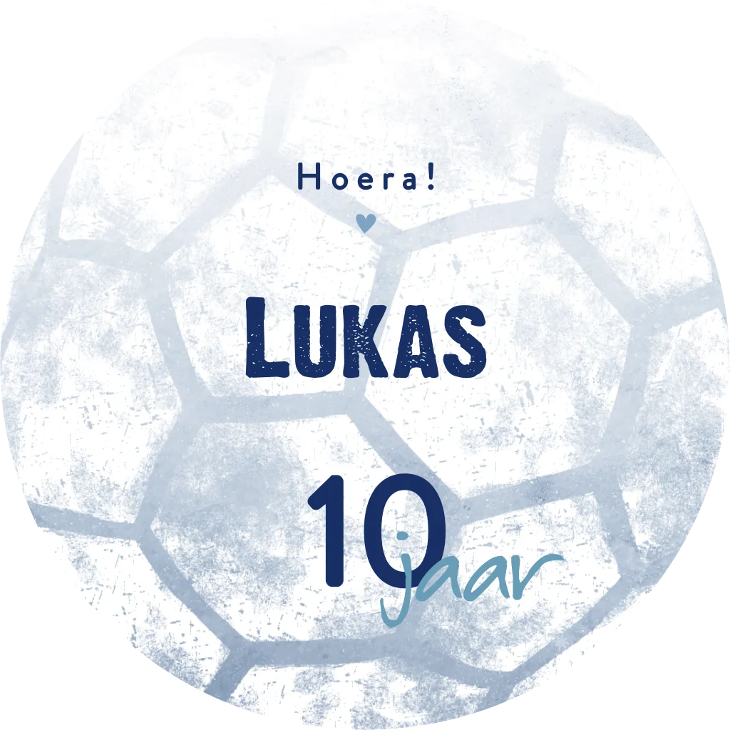 Stoere verjaardagsfeest uitnodiging kaart in een ronde vorm met illustratie van een voetbal op de achtergrond. De kleuren, teksten en het lettertype kun je zelf aanpassen.