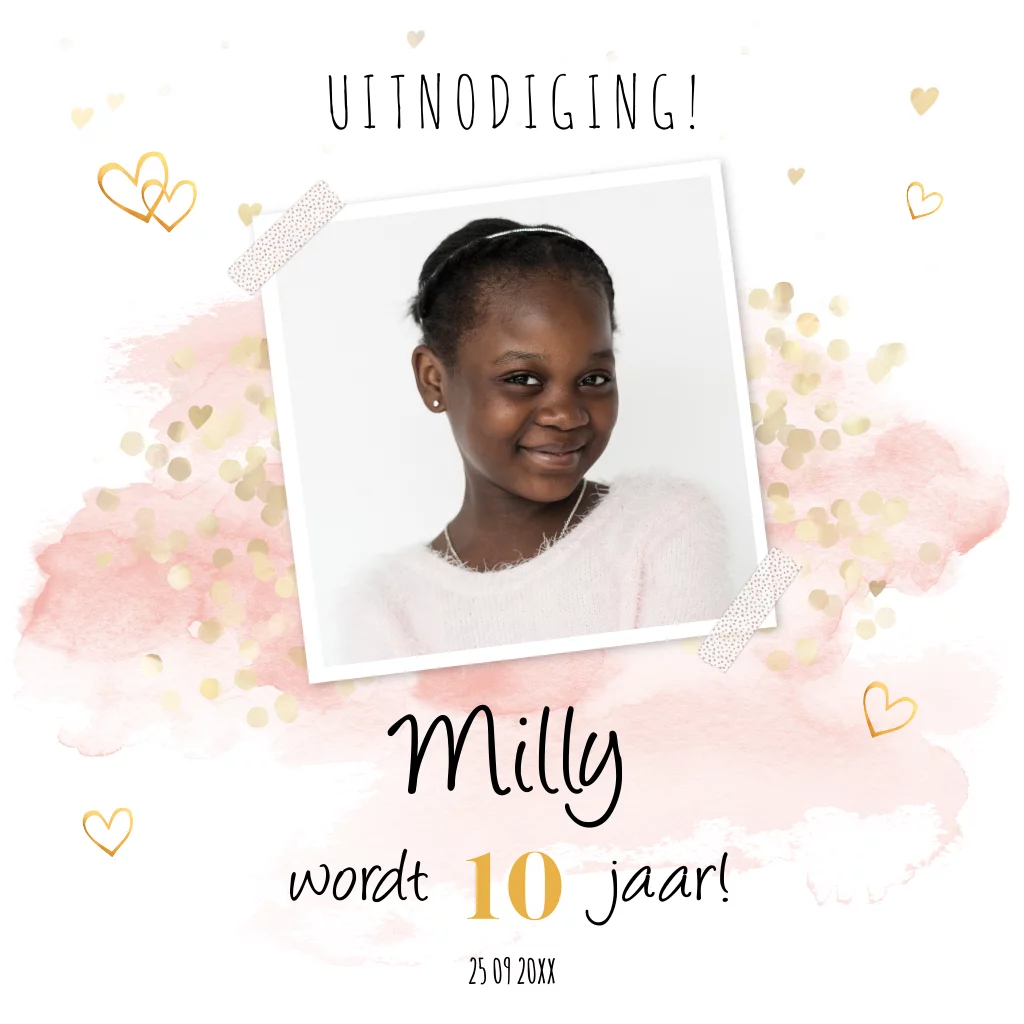 Leuke uitnodigingskaart voor een verjaardag met waterverf. Plaats je eigen foto en pas zelf eenvoudig de kleuren en teksten aan.