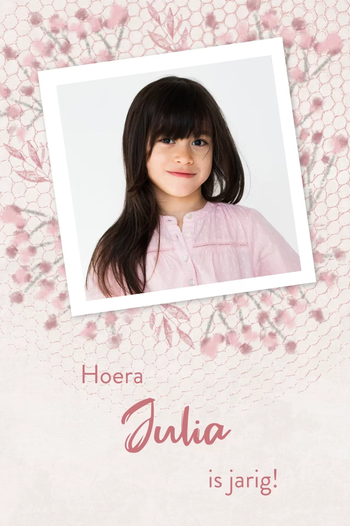 Een leuke fotokaart met kleine bloemetjes in roze tinten op tule voor een lief meisje en geschikt voor alle leeftijden