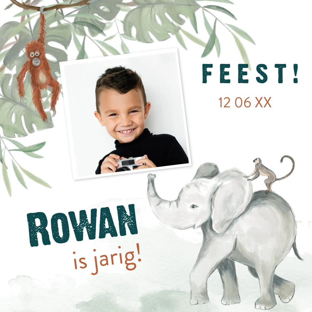 Leuke uitnodigingskaart voor een verjaardag met jungle thema. Plaats je eigen foto en pas zelf eenvoudig de kleuren en teksten aan.