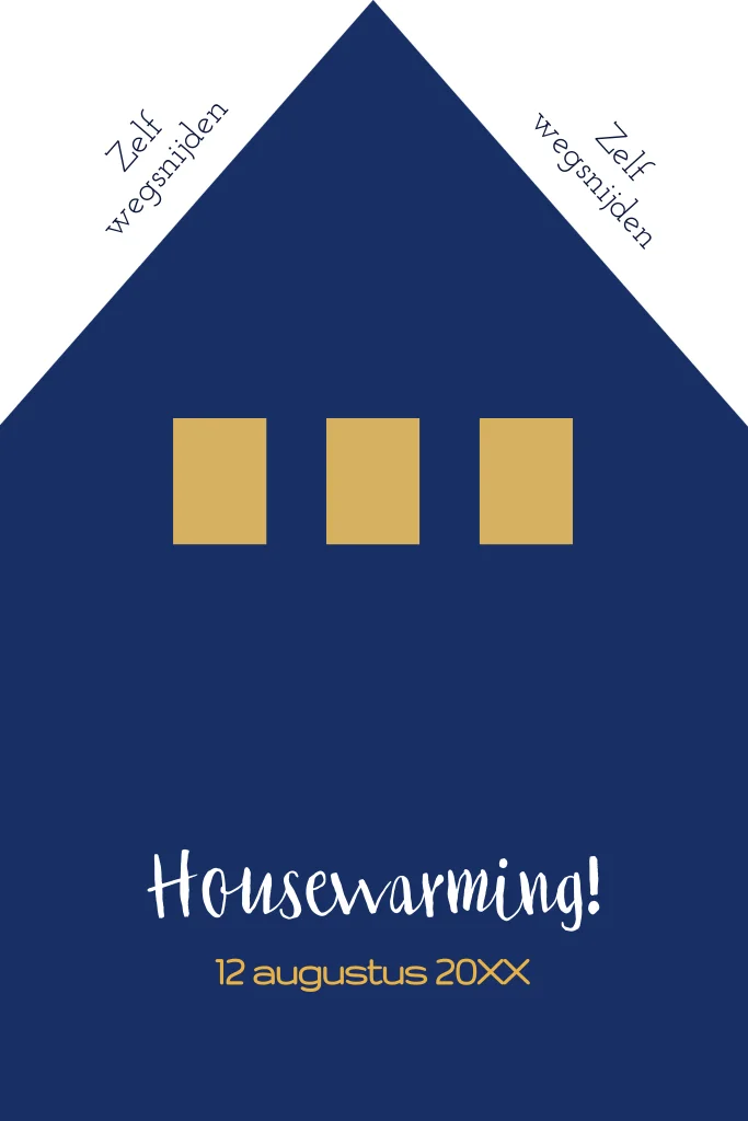 Originele verhuiskaart voor een housewarming, pas zelf de kleuren en teksten aan. Door de schuine delen weg te snijden ontstaat er de vorm van een huisje.