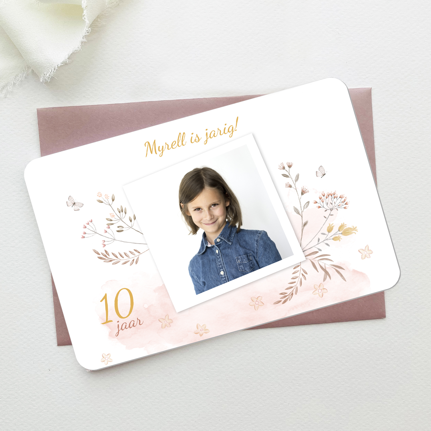 Een schattige uitnodiging voor een verjaardag met foto en bloemen