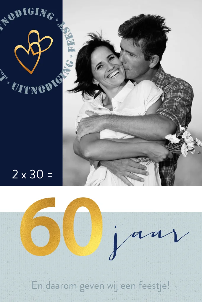 Staande uitnodiging voor een dubbele verjaardag met goudkleurige elementen die ook kunt vervangen. Plaats je leukste foto om deze kaart te personaliseren.