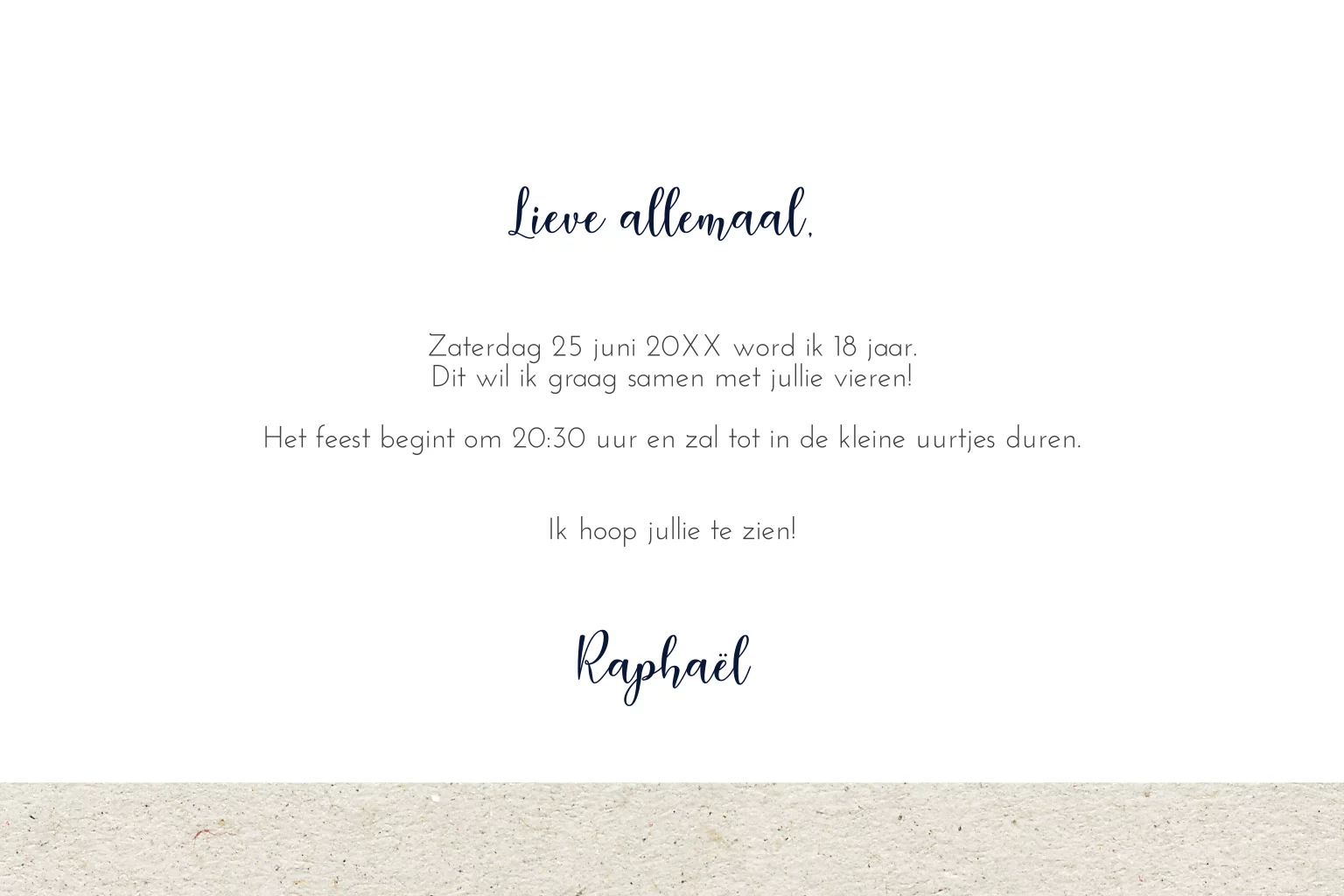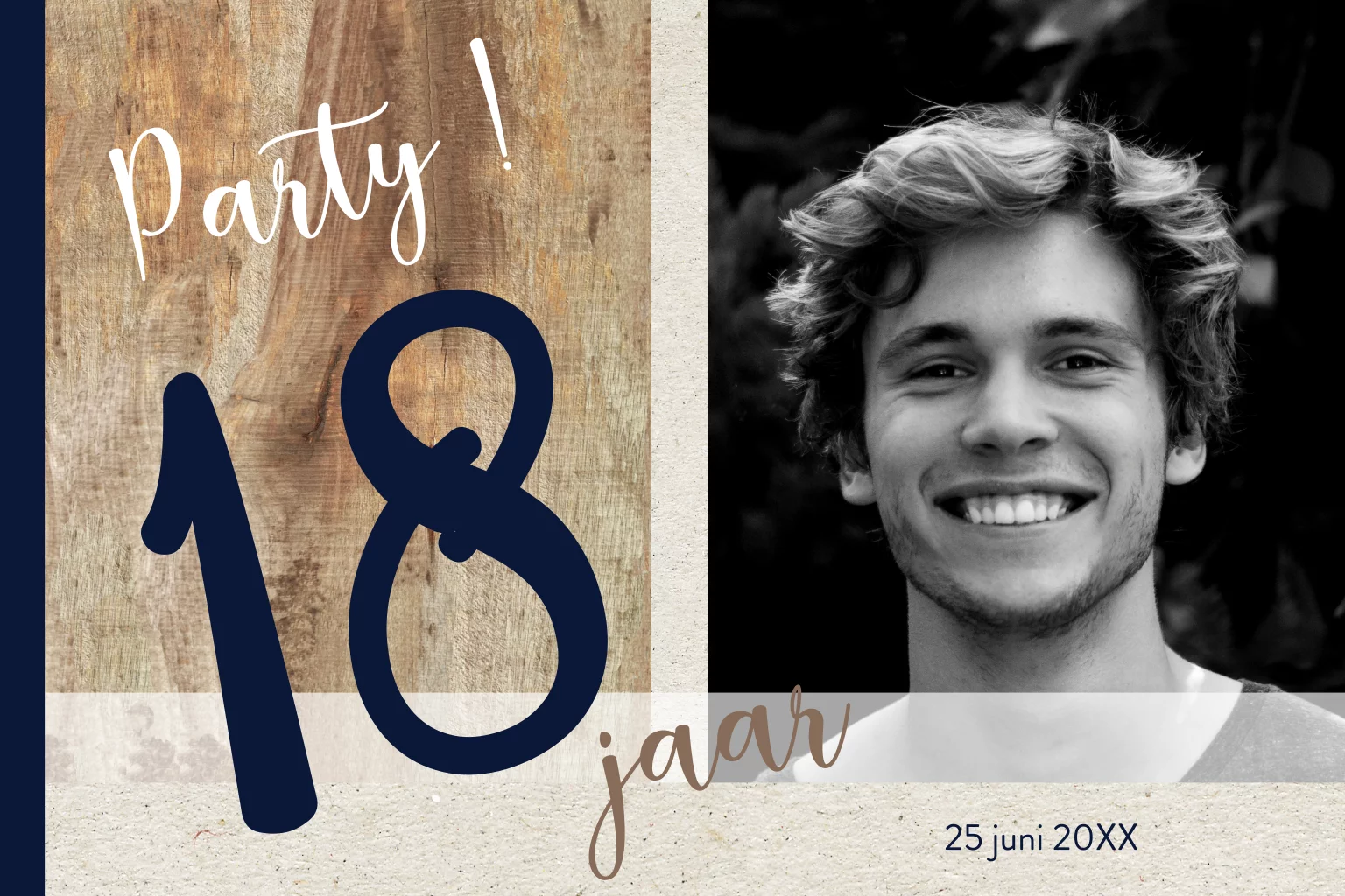 Deze toffe en stoere uitnodiging met hout-effect achtergrond kun je eenvoudig zelf aanpassen door de leeftijd te veranderen en een eigen foto te uploaden. Deze kaart is geschikt voor een verjaardag of een jubileum.