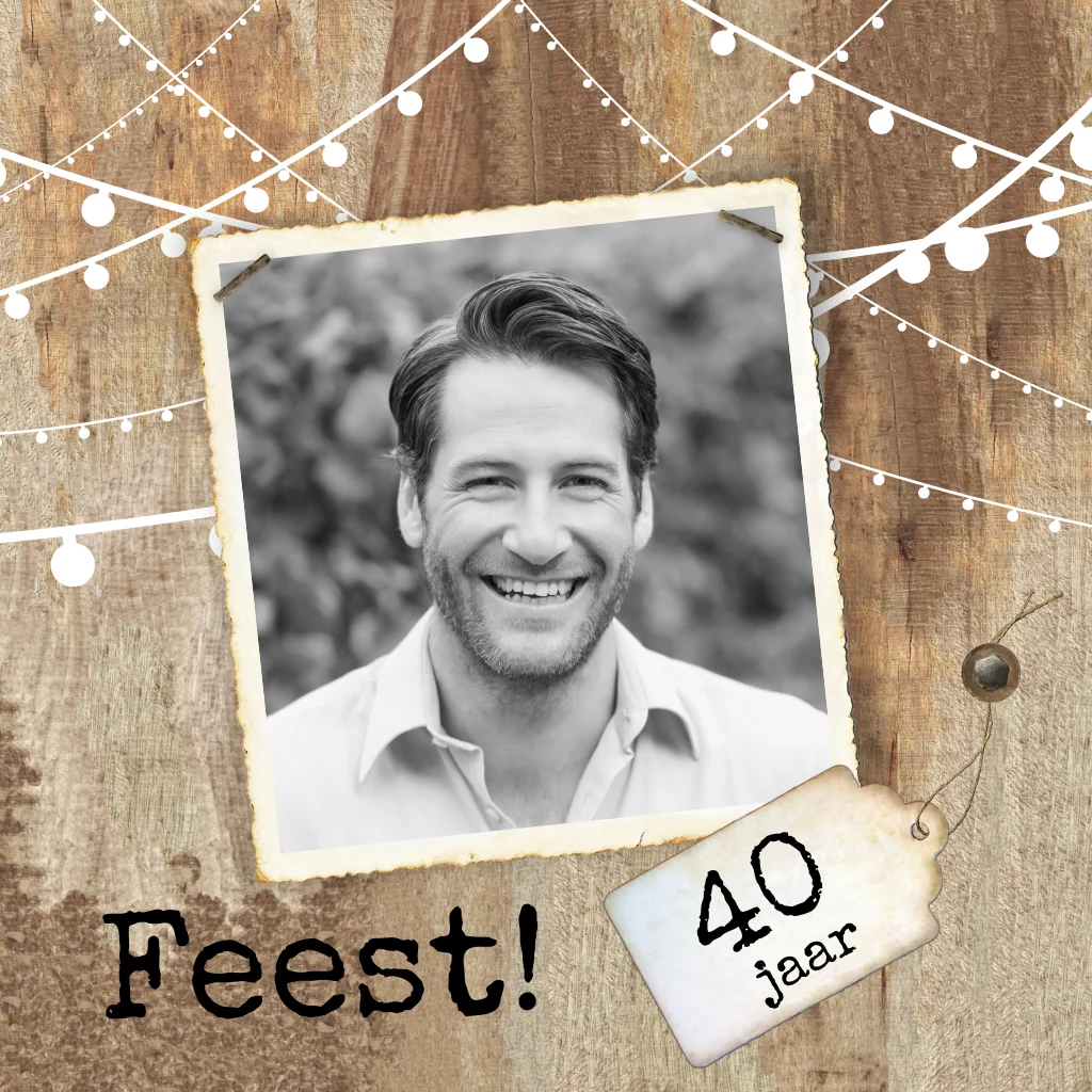 Fotokaart voor verjaardag met sloophout achtergrond en slingers. Deze kaart kun je eenvoudig zelf personaliseren.