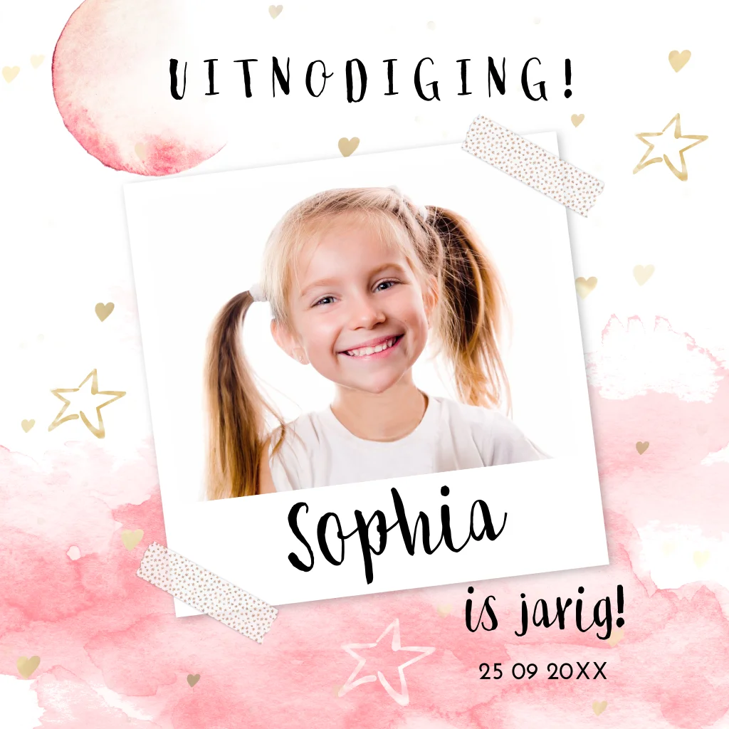 Leuke uitnodigingskaart voor een verjaardag met waterverf. Plaats je eigen foto en pas zelf eenvoudig de kleuren en teksten aan.